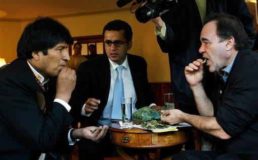 In this photo released by Bolivia's Presidency, Bolivia's President Evo Morales, left, and U.S. film director US film director Oliver Stone, right, share coca leaves during a meeting in La Paz, Tuesday, Jan. 13, 2009. (AP Photo/Bolivia's Presidency/Jose Luis Quintana)